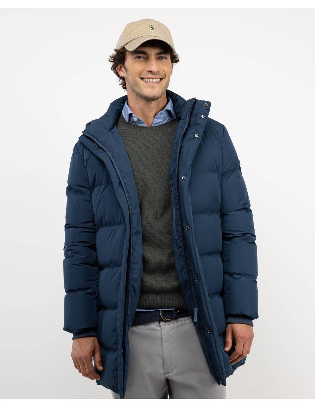 Abrigo largo acolchado de hombre. Relleno interior de pluma reciclada. Tejido de poliéster repelente al agua. Corte Regular Fit. Cuello con capucha desmontable con cremallera. Cierre con cremallera y tapeta con solpas.